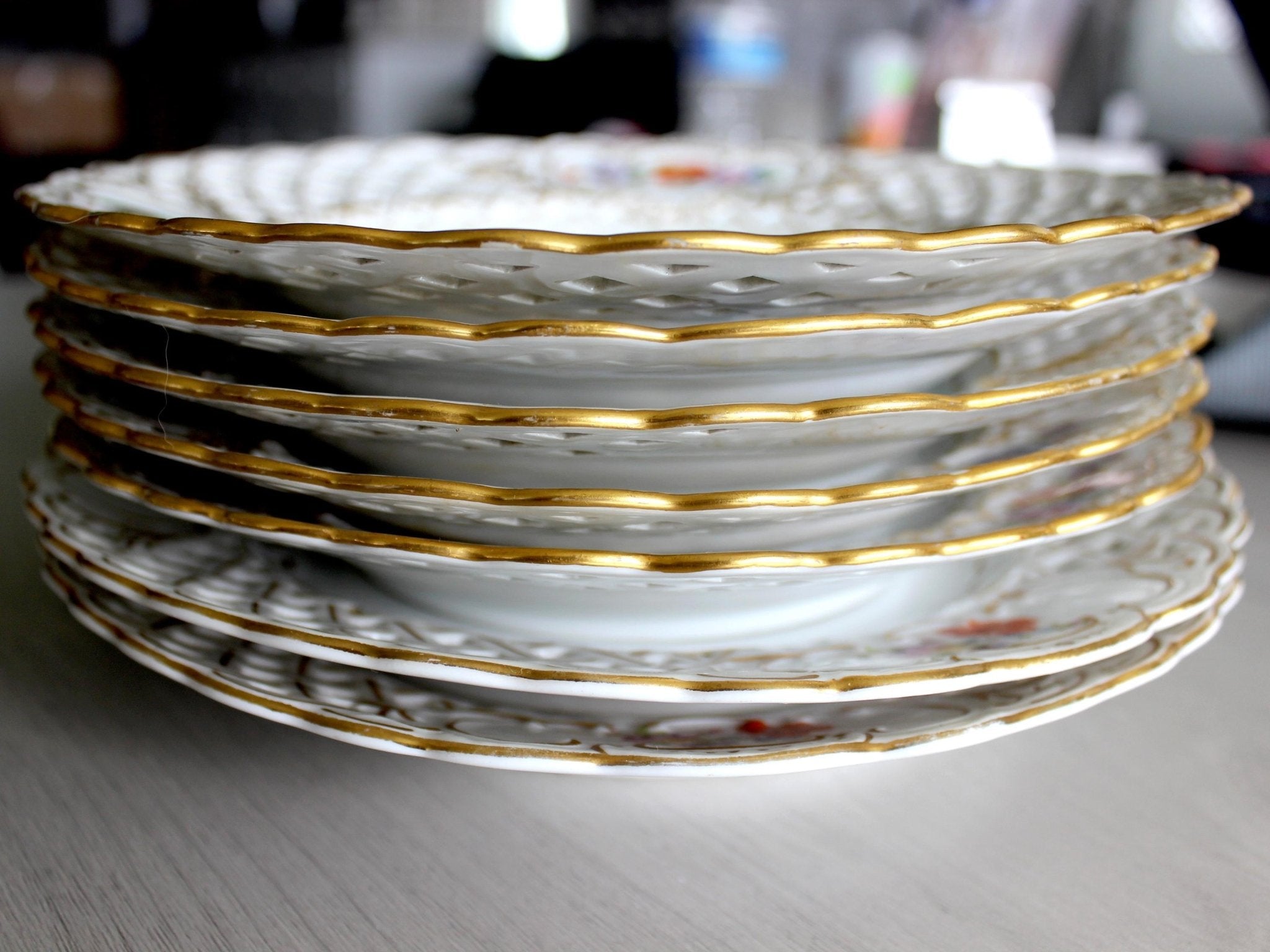 Seven x 8 Inch Antique Meissen Germany Porcelain Hand Painted Reticulated Plates - Collectible, One price for the lot!