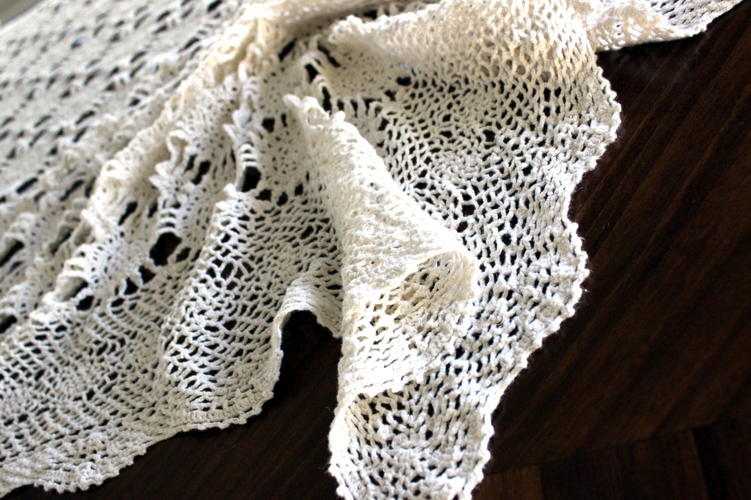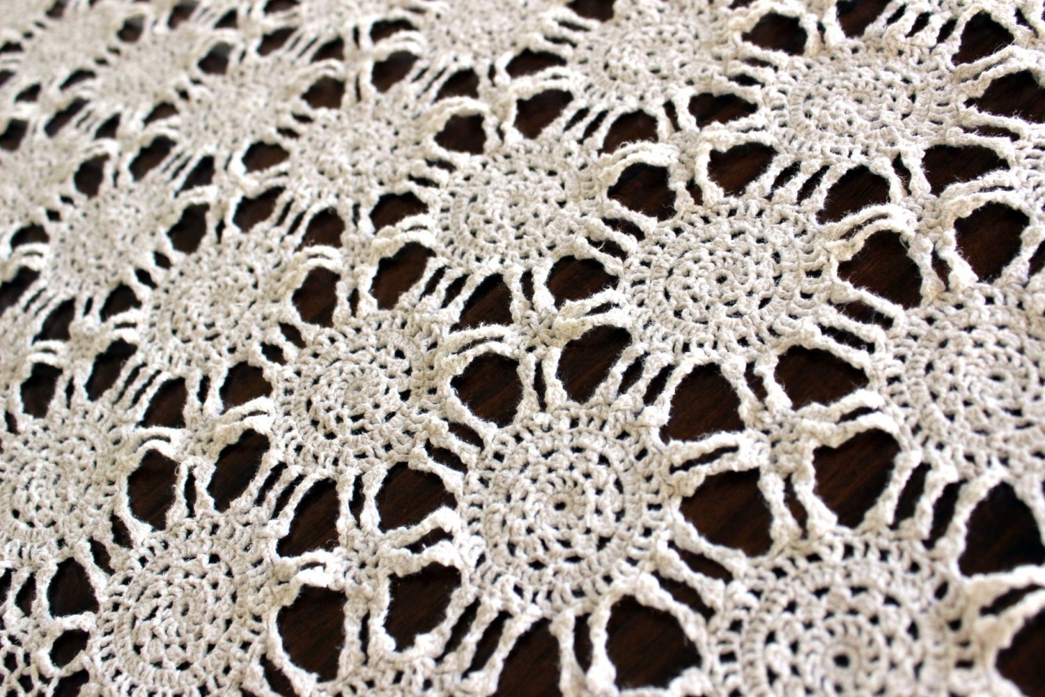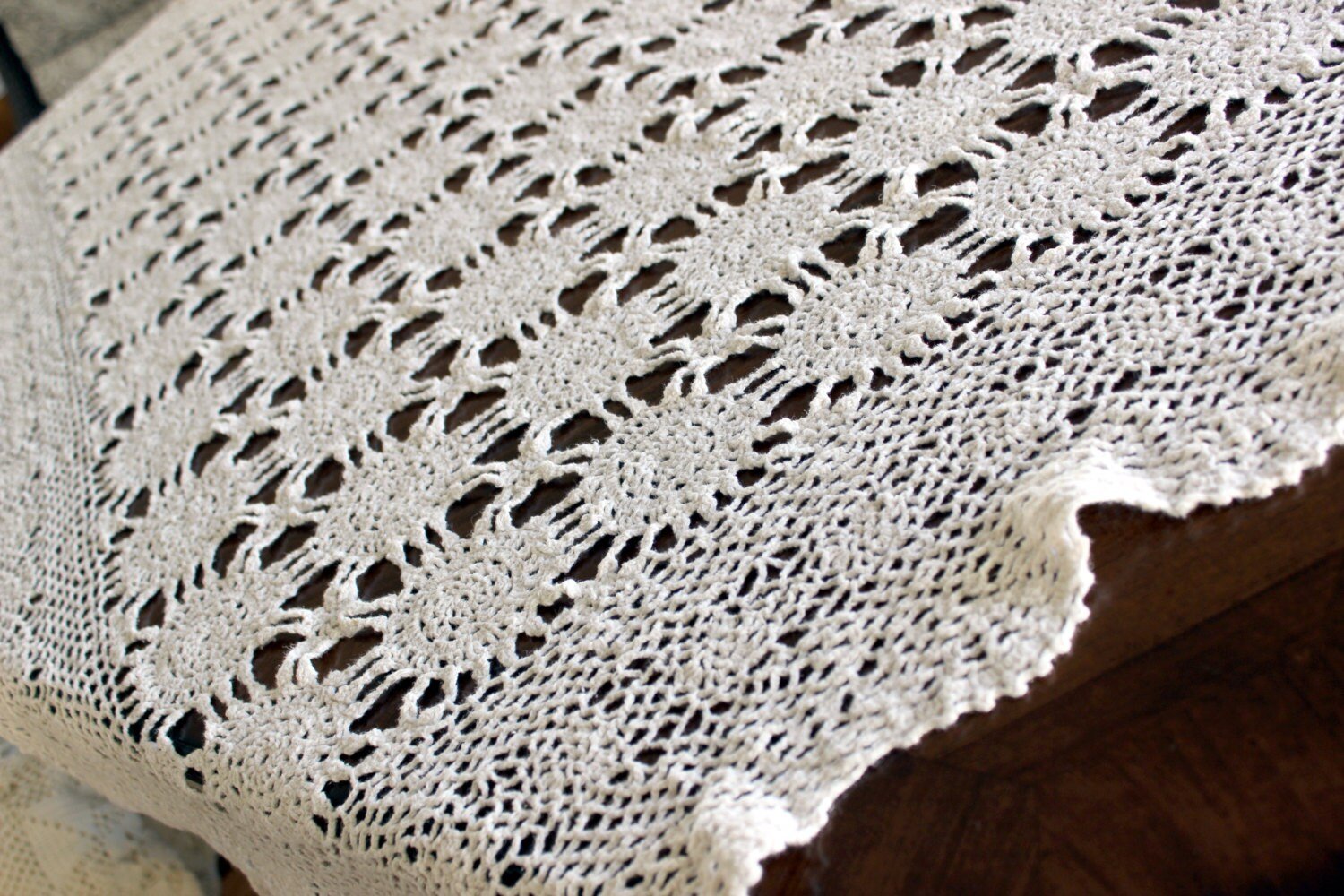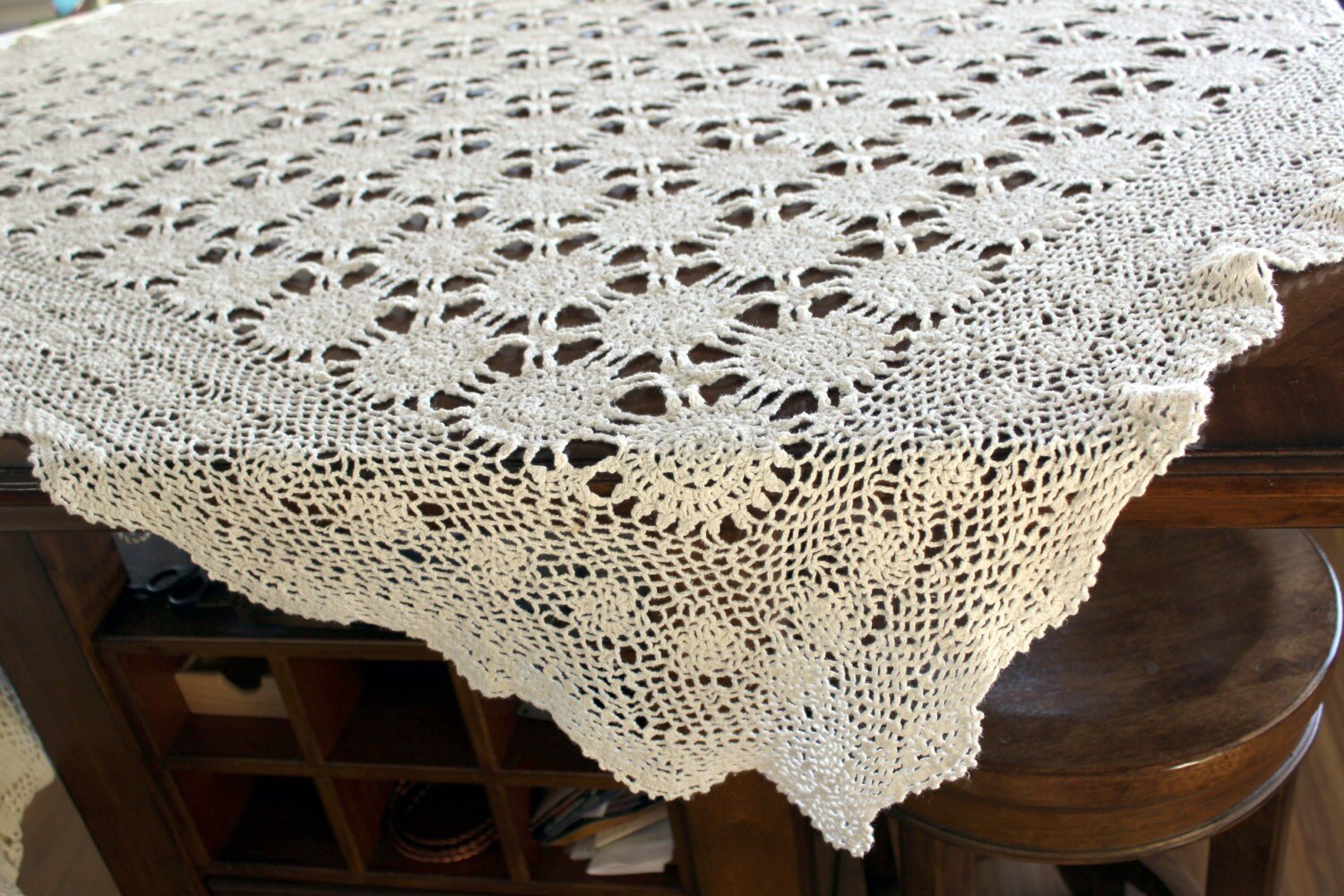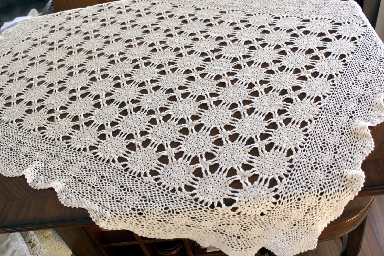 Crochet Tablecloth, Vintage Table Cloth, Wagon Wheel Pattern, Pale Cream, Vintage Linens