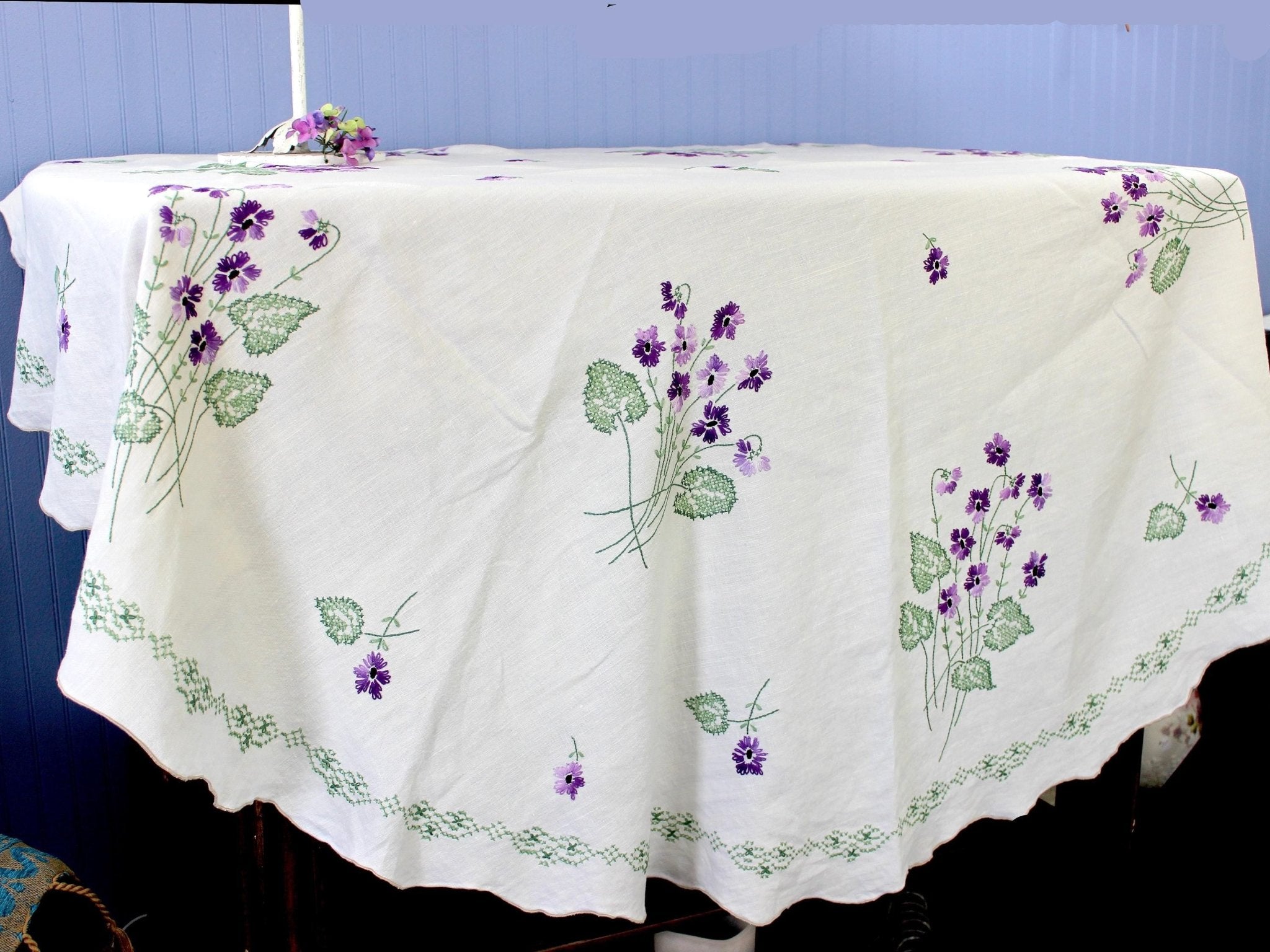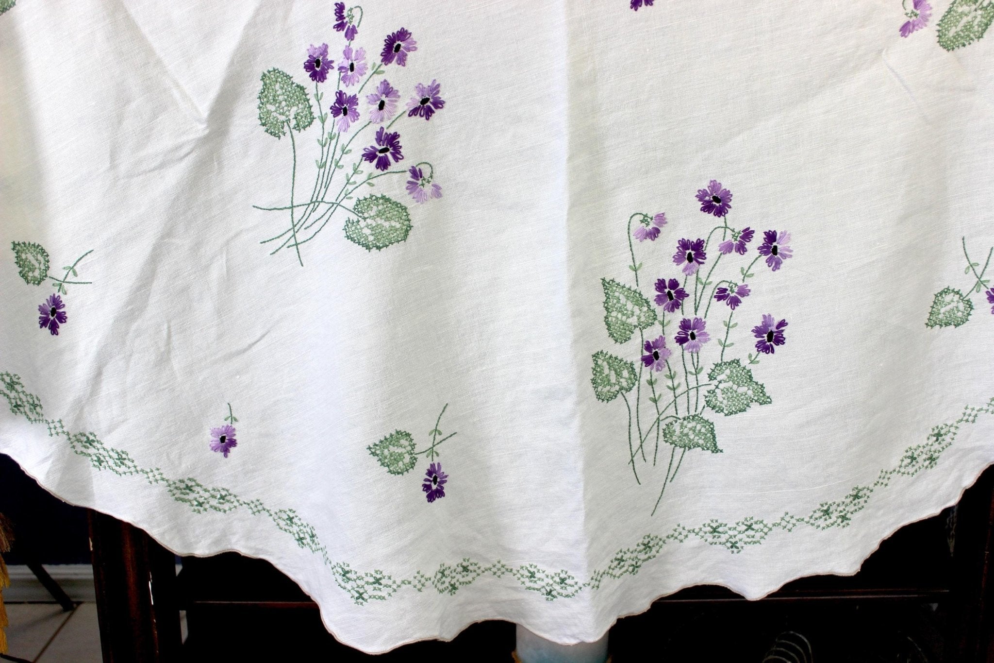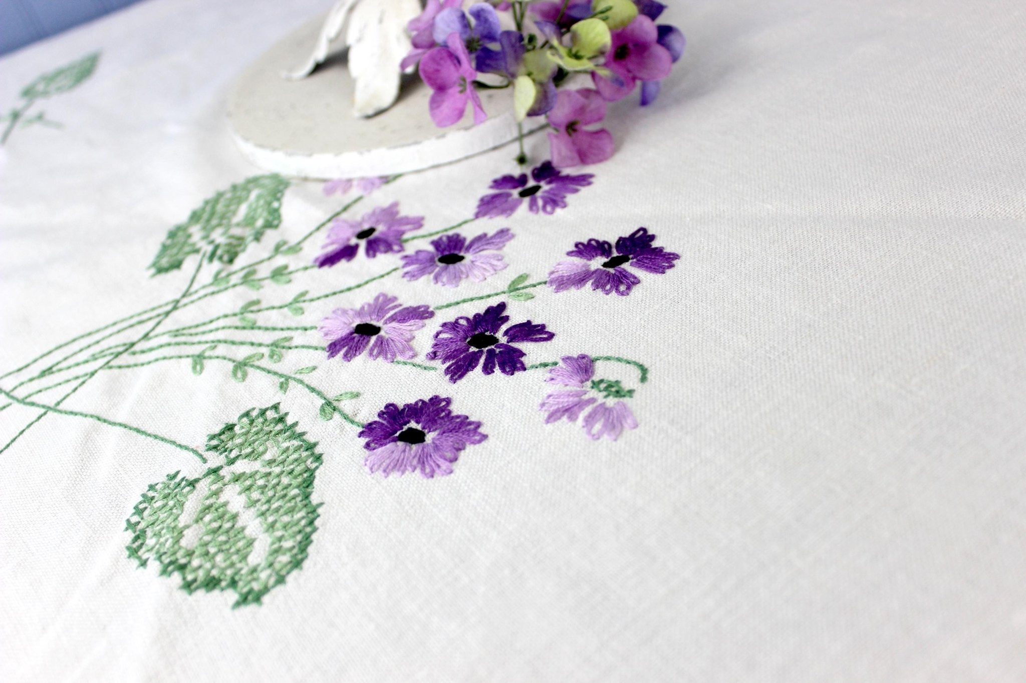 Vintage Linen Table Cloth, White Tablecloth, Daisy Embroidery, Blanket Stitched Edges 18785