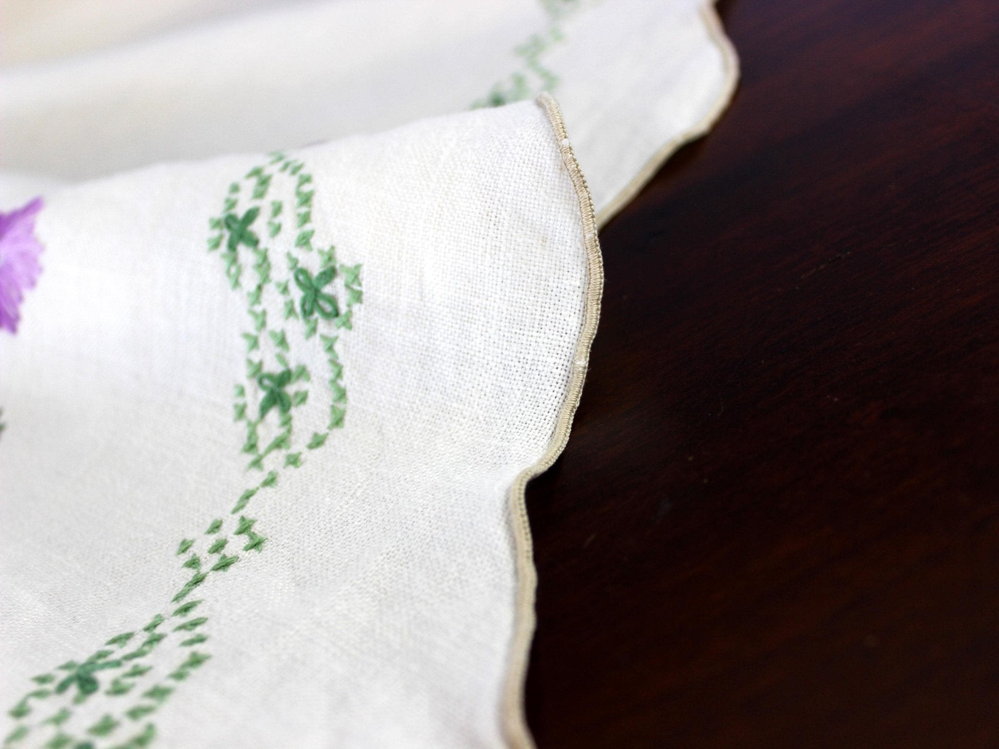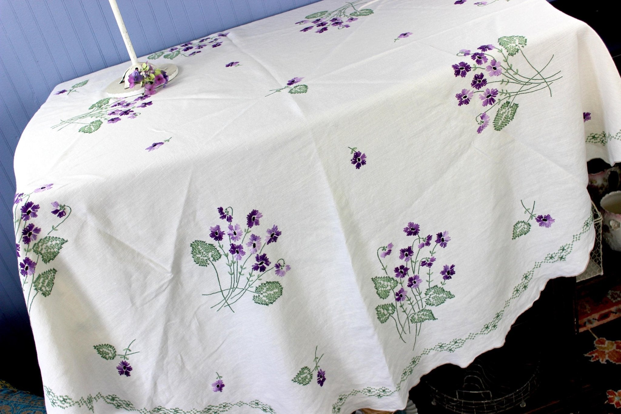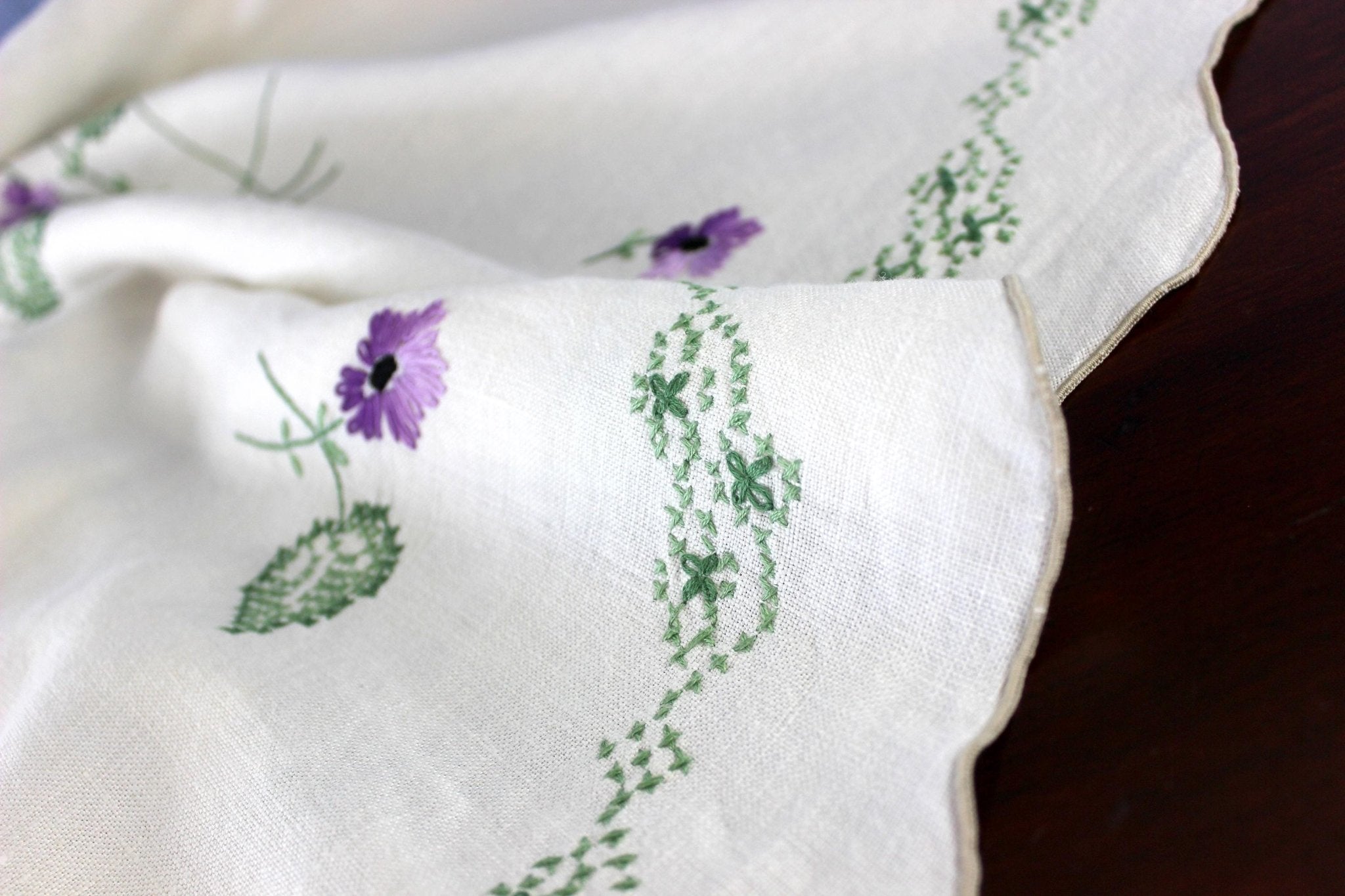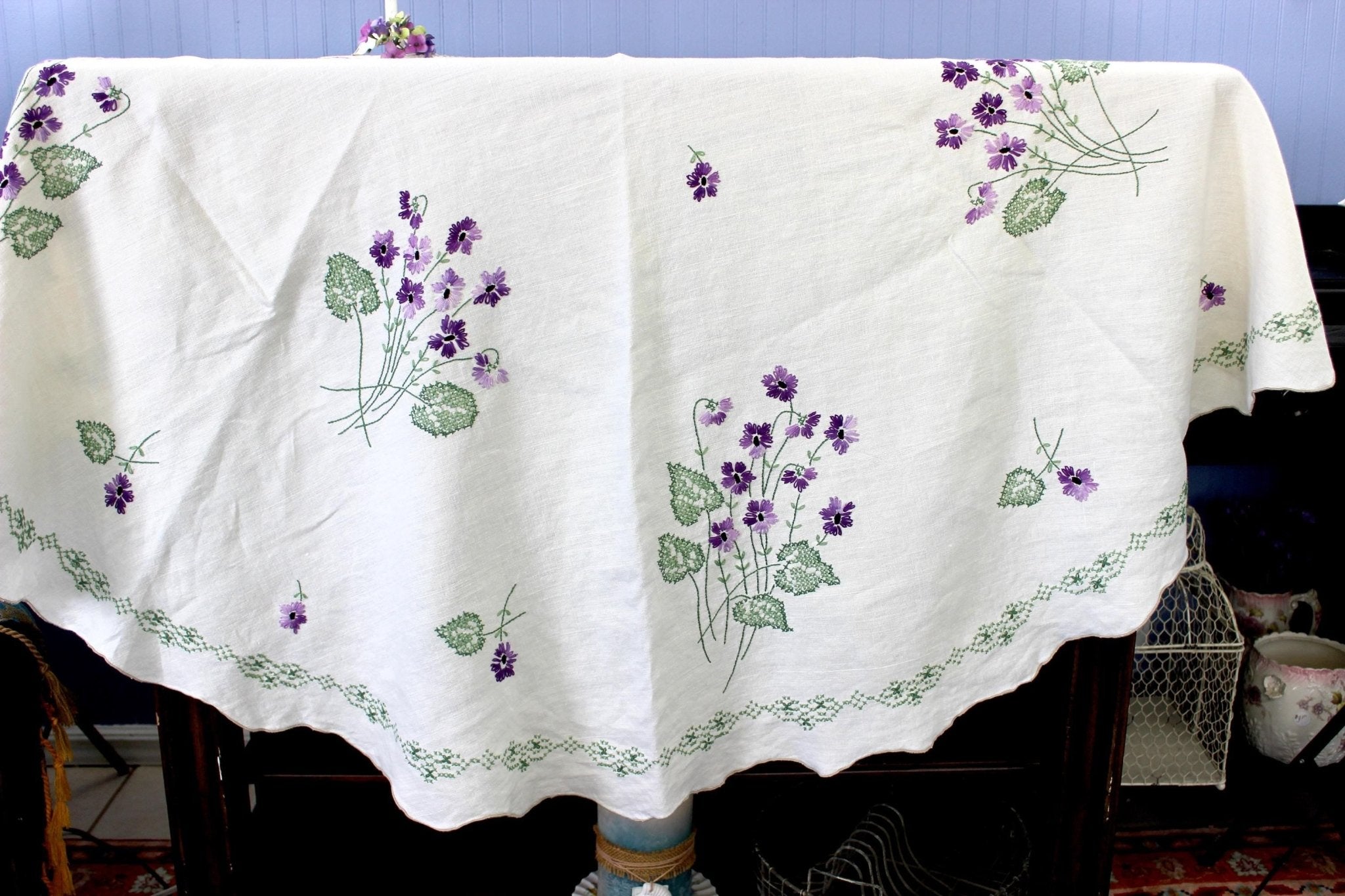Vintage Linen Table Cloth, White Tablecloth, Daisy Embroidery, Blanket Stitched Edges 18785