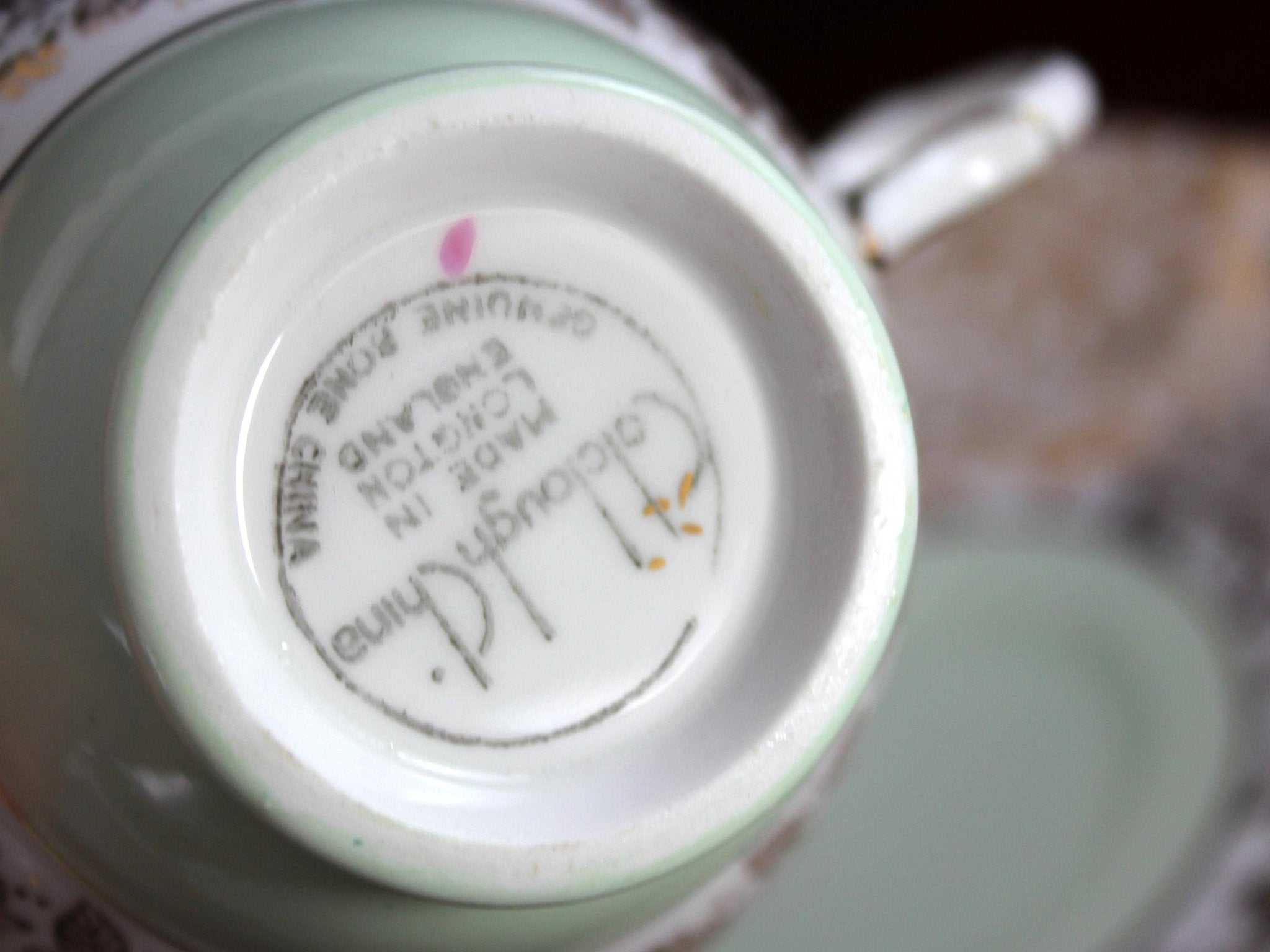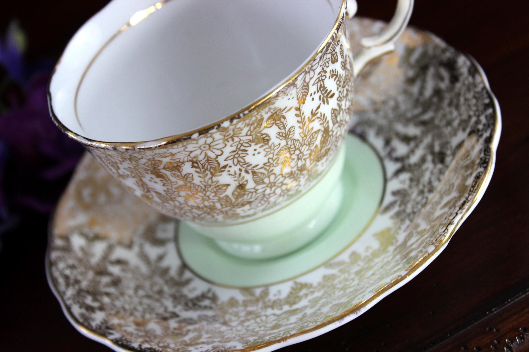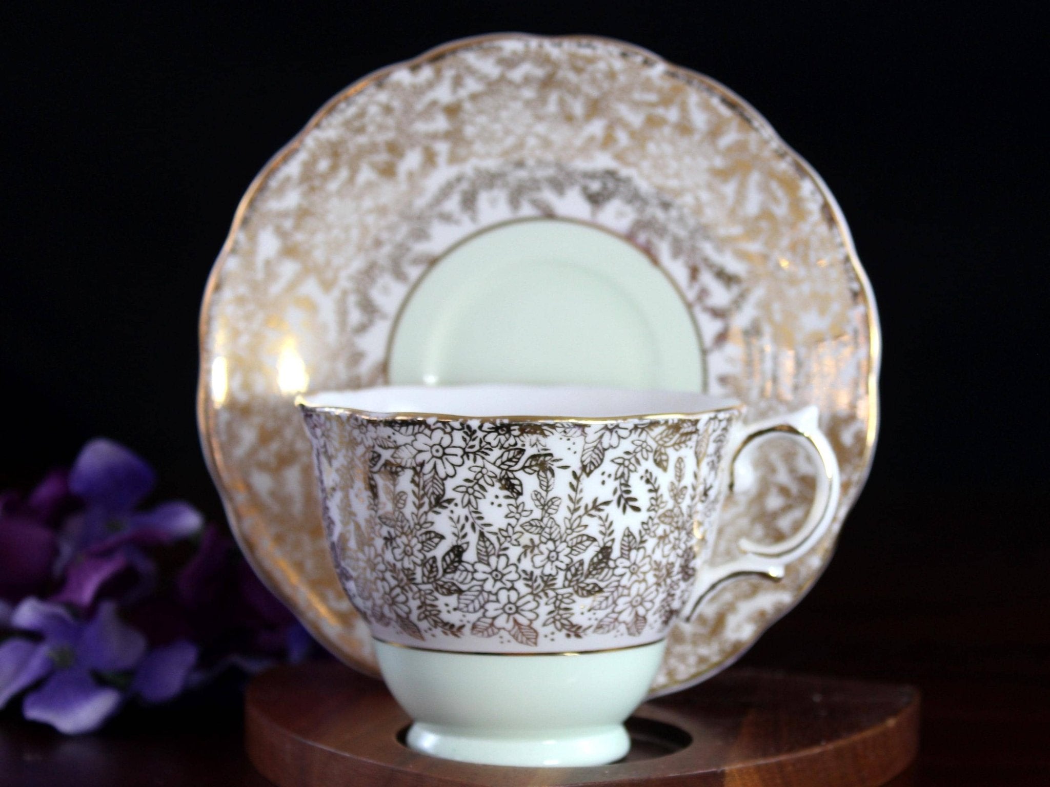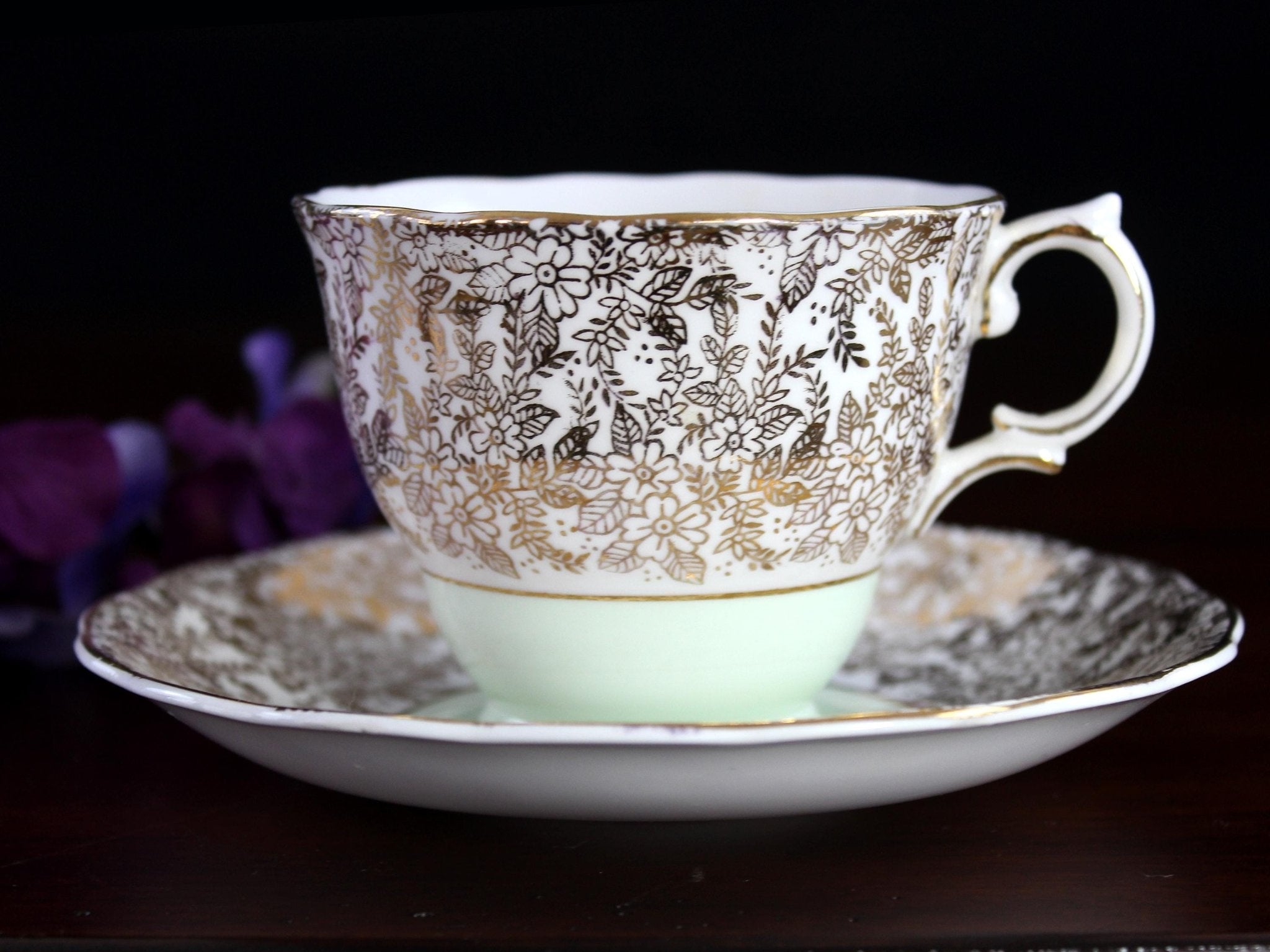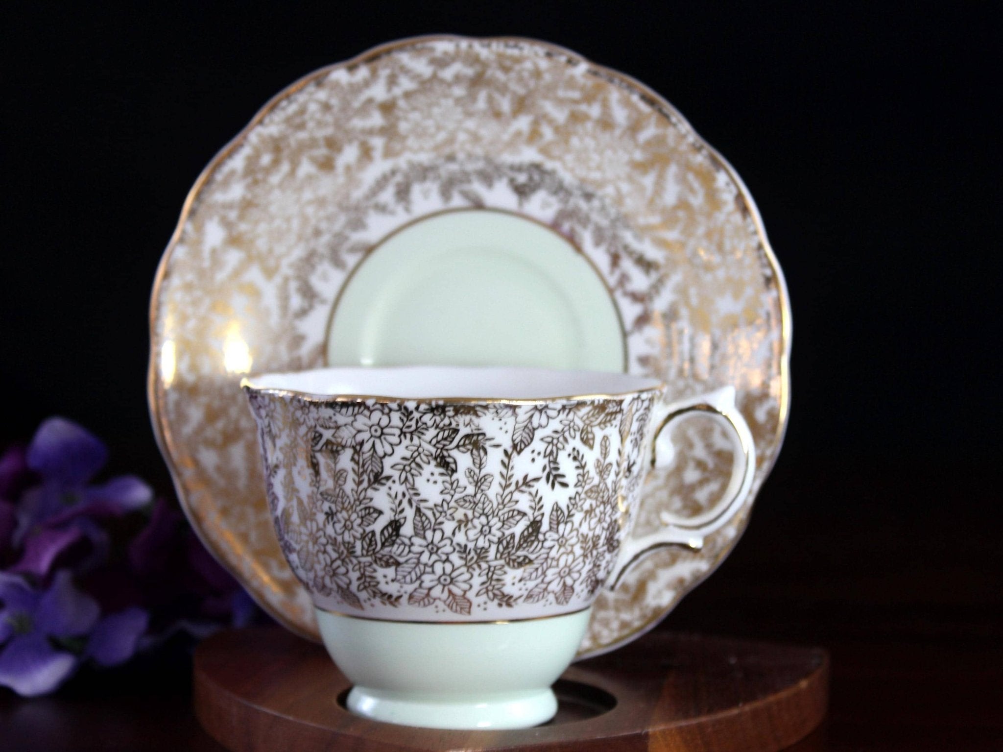 Upgrade your teatime game with this stunning Vintage Teacup and Saucer | Colclough Gilt Chintz | Minty Green Banding.