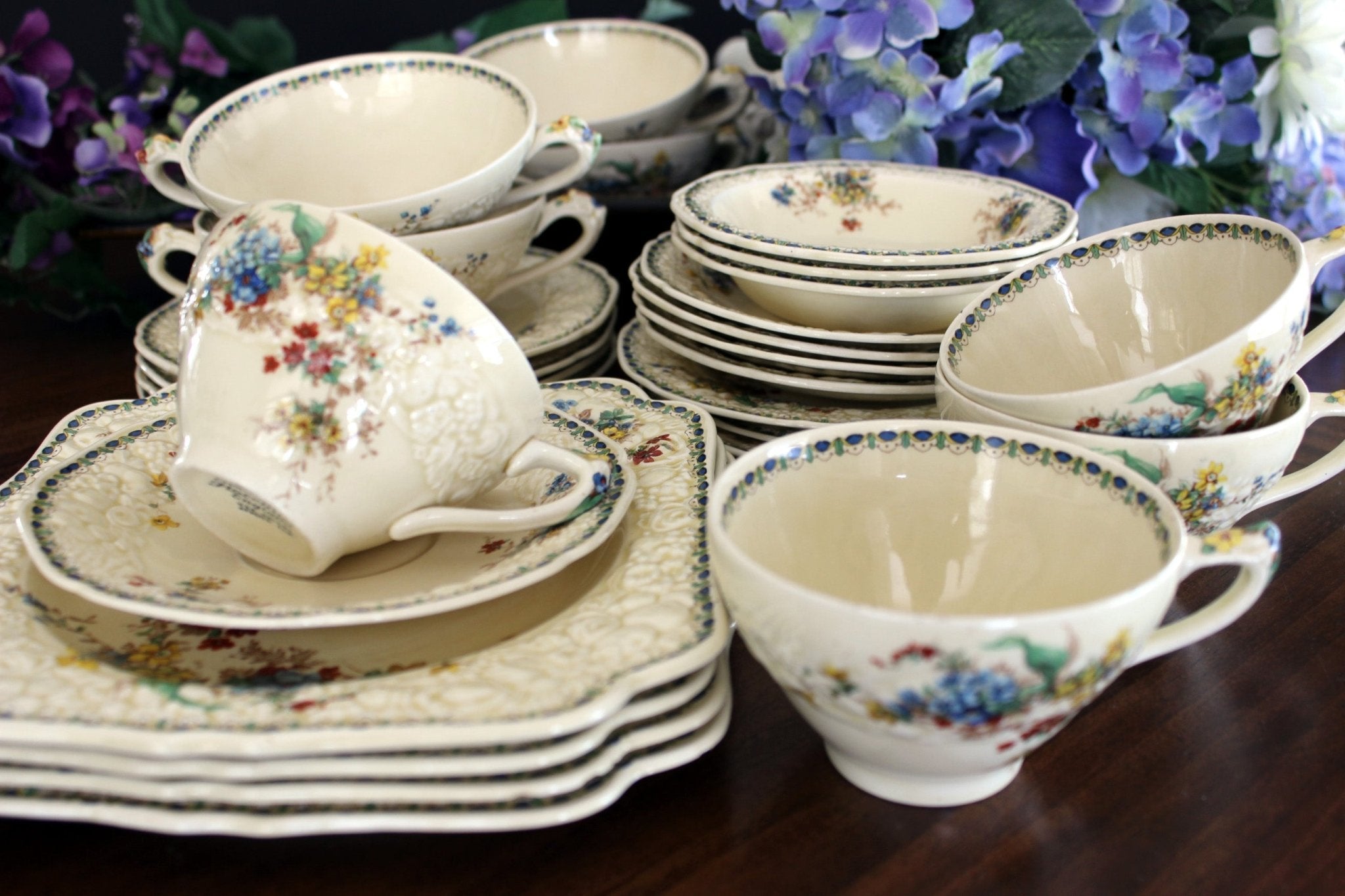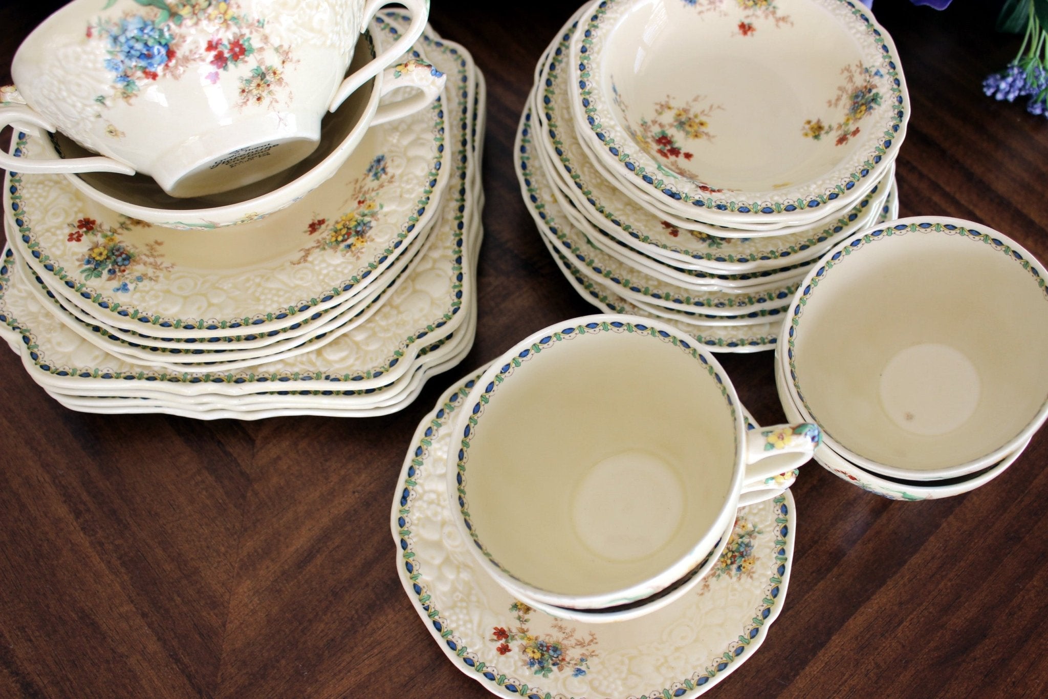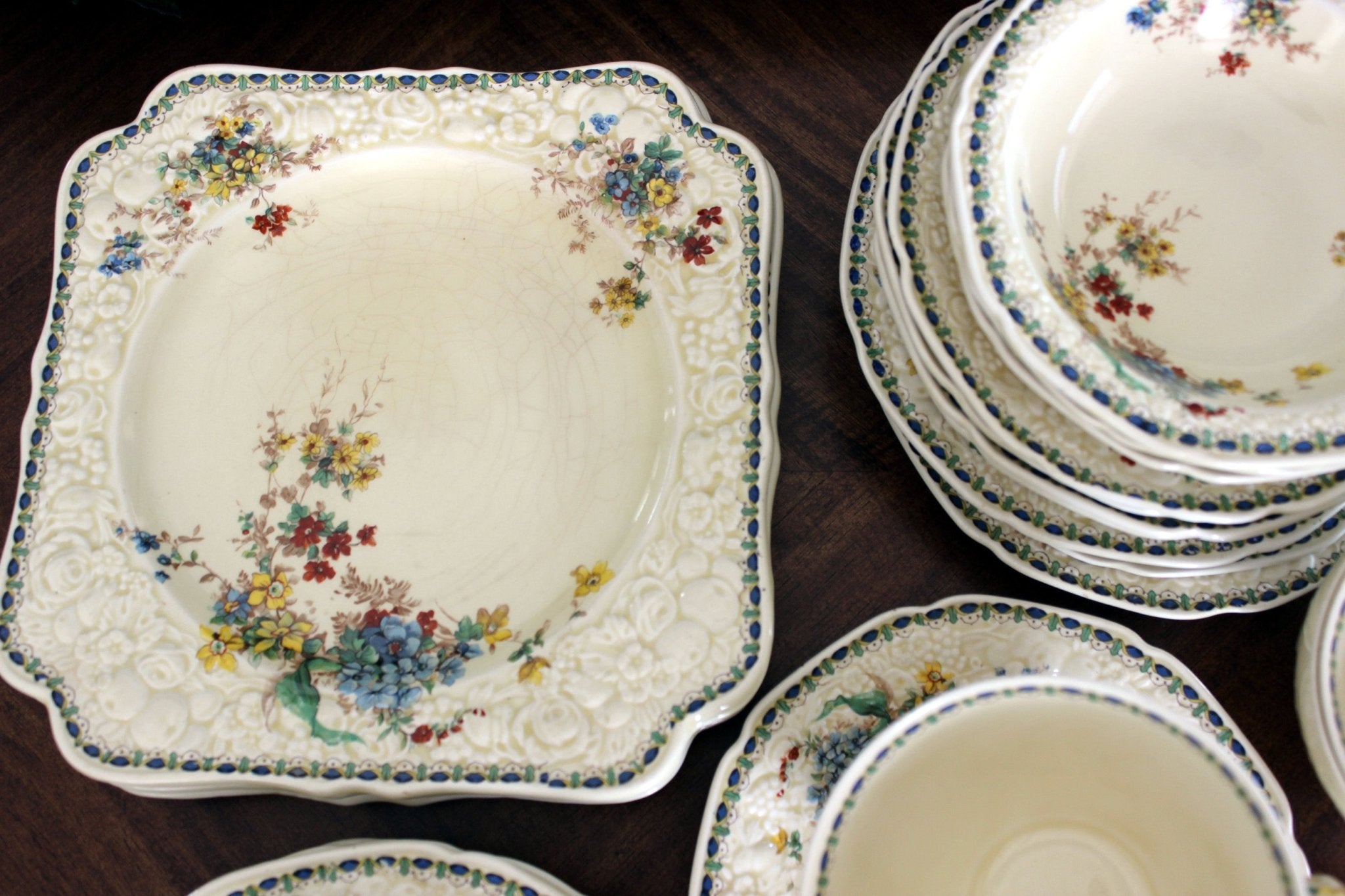 Deliciously decorated in an exquisite design of hand painted florals over a raised mold. Cream in color. Significant crazing, some discolored, is noted on most pieces. No cracks but a small chip or nibble here and there, I counted 3.
