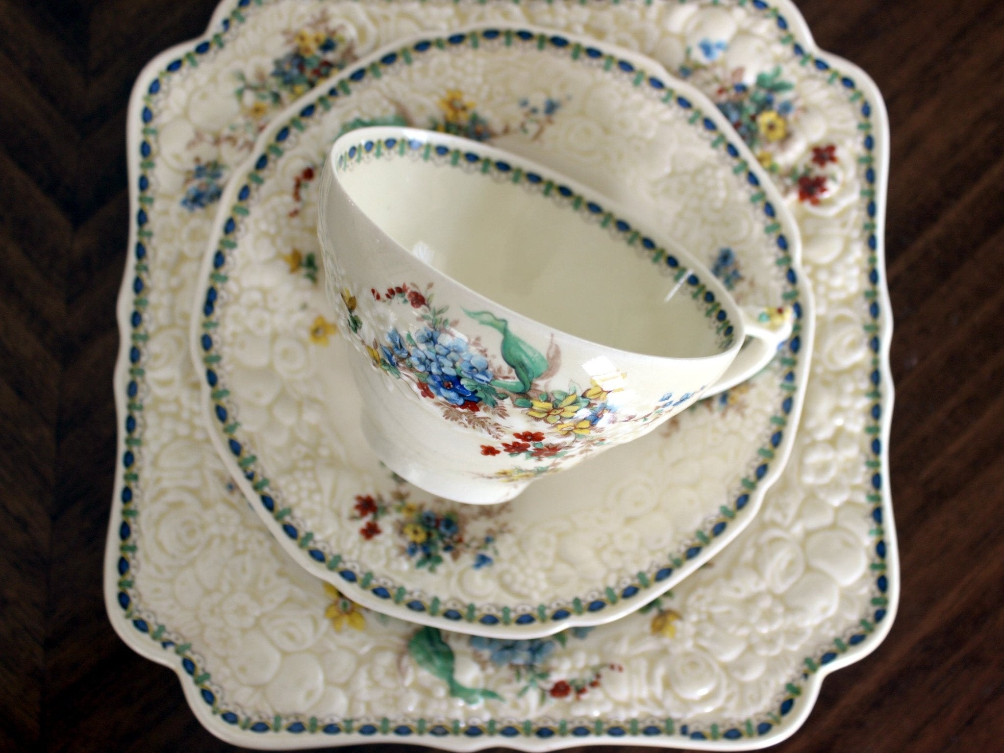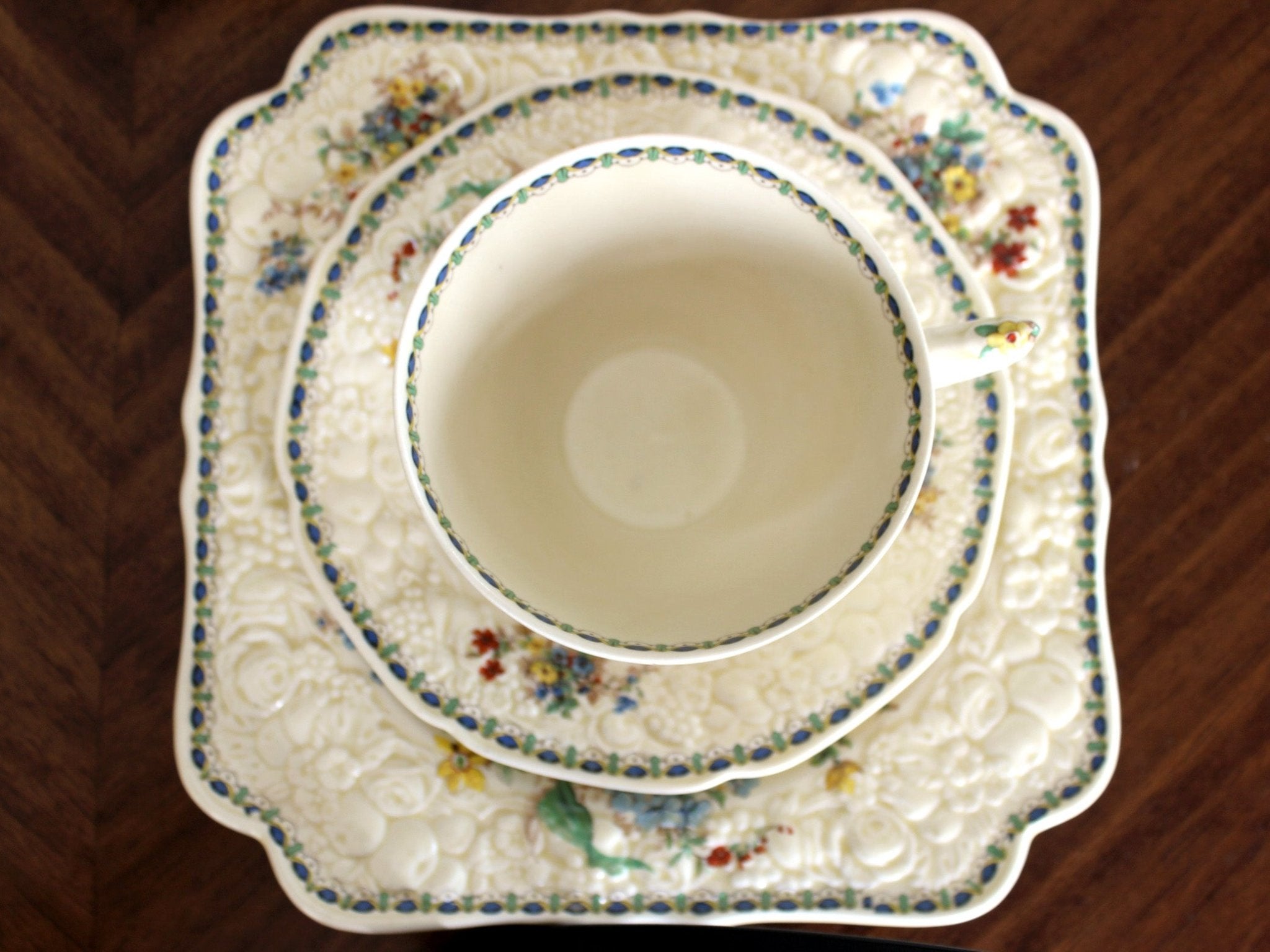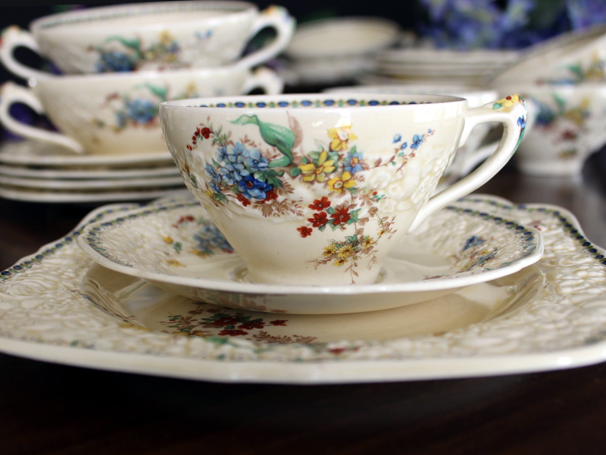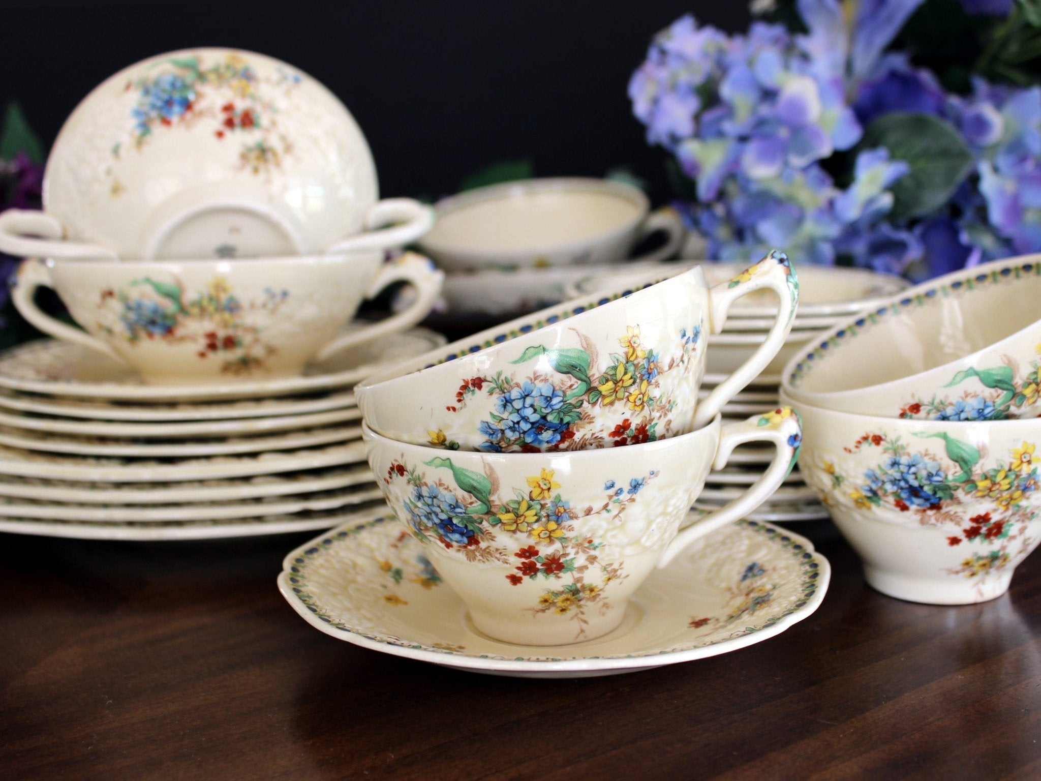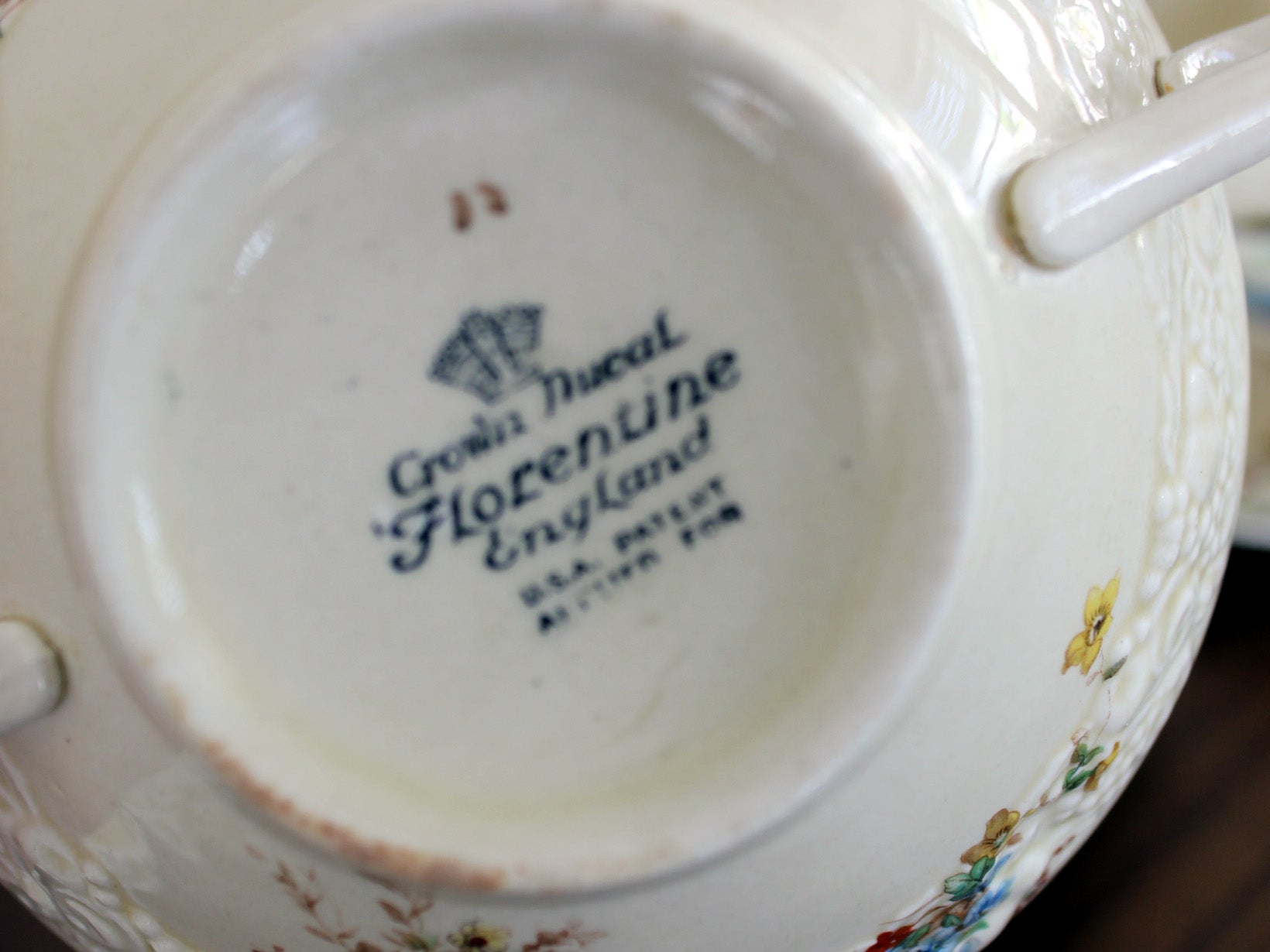 28 Pieces! One Price! Antique Crown Ducal Ware, Bullion Cups & Saucers, Florentine Soup Cup Trios Lot plus Berry Bowls
